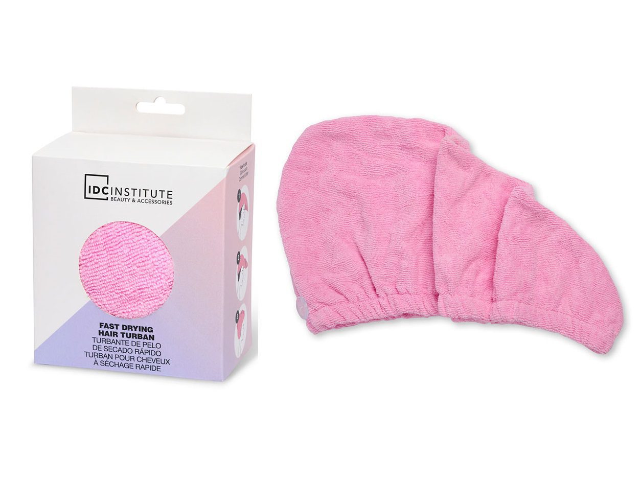 Το IDC Institute Fast Drying Hair Turban είναι μια πετσέτα-τυρμπάν για μαλλιά σχεδιασμένη να επιταχύνει το στέγνωμα των μαλλιών μετά το λούσιμο, προσφέροντας μια πρακτική και άνετη εναλλακτική στη χρήση παραδοσιακής πετσέτας. Κατασκευασμένο από απαλή και απορροφητική μικροΐνα, αυτό το τουρμπάνι μειώνει το χρόνο στεγνώματος έως και περίπου 50 %, βοηθώντας να απομακρυνθεί η υπερβολική υγρασία χωρίς την ανάγκη υπερβολικής θερμότητας ή τριβής, που μπορούν να φθείρουν ή να φριζάρουν τα μαλλιά. Το προϊόν έχει εργονομικό σχήμα τουρμπάνου με κουμπί στερέωσης στο πίσω μέρος, ώστε να μένει σταθερό στο κεφάλι ενώ κάνεις άλλα πράγματα (π.χ. ρουτίνα περιποίησης ή μακιγιάζ), και είναι επαναχρησιμοποιούμενο και πλενόμενο στο πλυντήριο χωρίς να χάνει τις απορροφητικές του ιδιότητες.